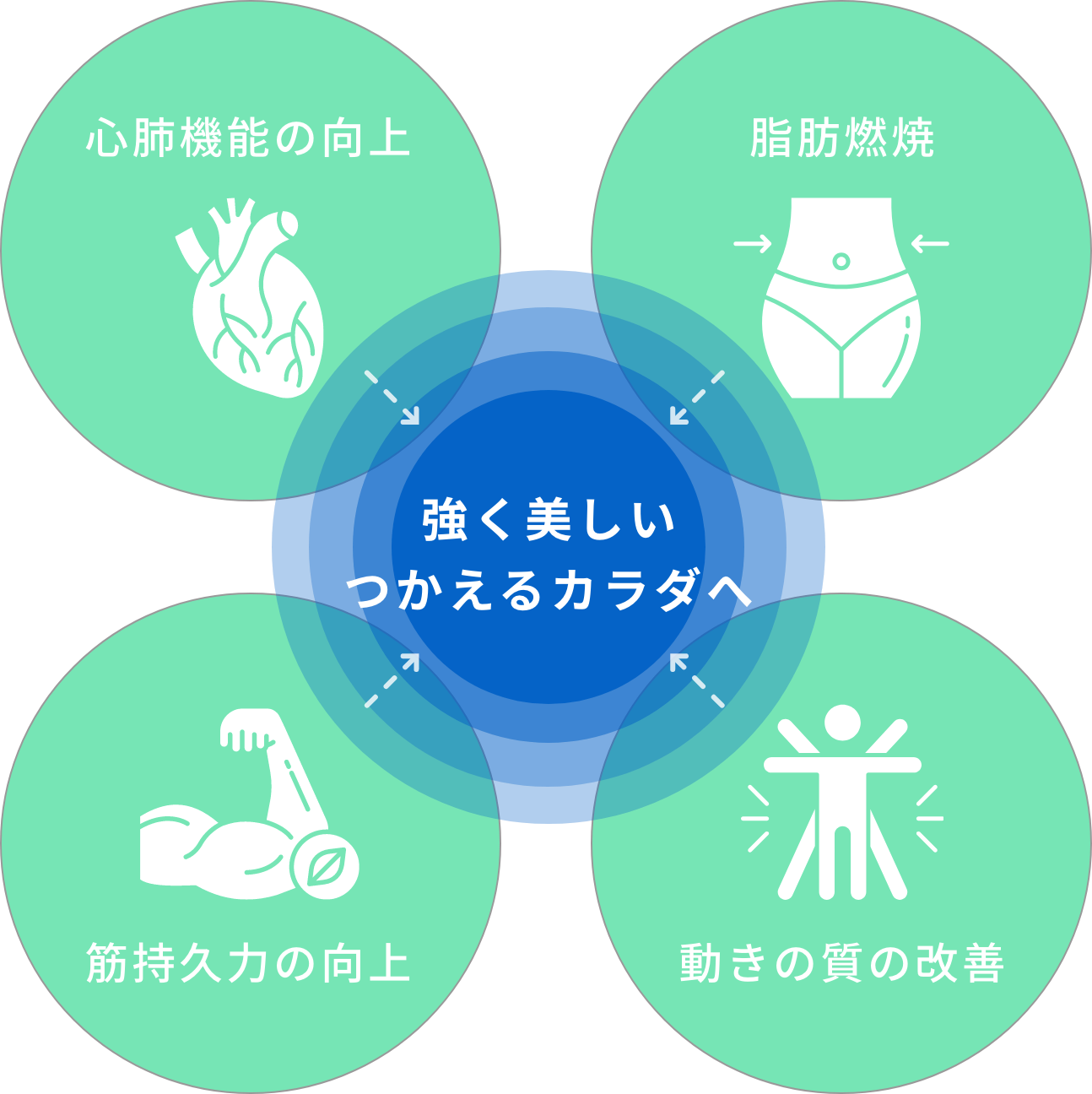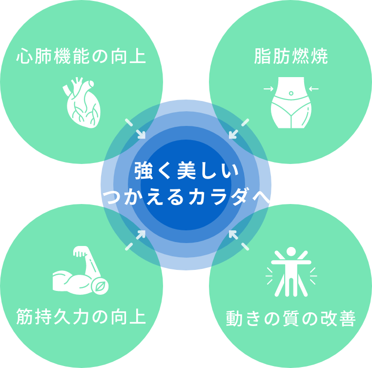 有酸素運動と筋力トレーニングを組み合わせることで、心肺機能(身体に酸素を送り届ける力)・筋持久力・脂肪燃焼・動きの質(身体バランスや動きの精度など)が高まり、強く美しく、使えるカラダへとつながります。